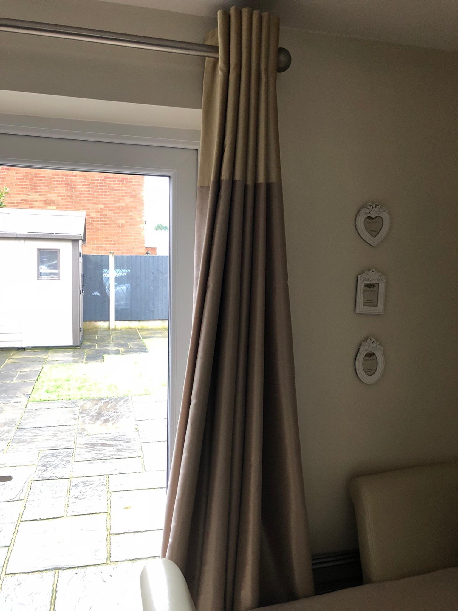 2 pairs of dunelm mills lux curtains rich burgundy red and champagne beige ring tops lined and comes with matching tie backs one pair 166.